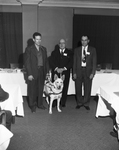 Joseph W. Jones, center, of Hollywood, California, president of International Guiding Eyes, Incorporated, presented Jill, a seeing-eye dog, to Bert L. Hutchison, left, machinist of 908 North West 25th, at the Texas State Council of Machinists meeting. At right is Council President Frank Paradowski.
