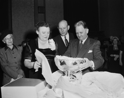 Reverend Warren Johnston, right, who is moving to Baton Rouge after a 10-year pastorate at First Methodist Church, and Mrs. Johnston unwrap the silver punch bowl presented them by R. H. Mccreless, official board chairman, on behalf of the church.