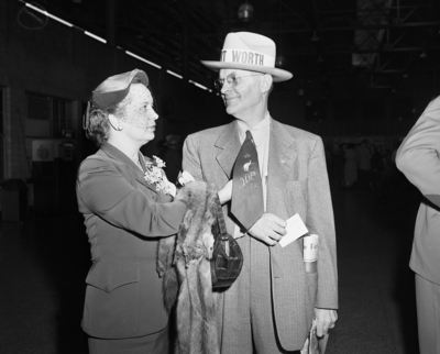 Mr. and Mrs. J. Vance Hoagland are shown at T&P Station just after leaving Texas special to New York Eisenhower rally. Hoagland's "I Like Ike" necktie (decorated with five stars and elephant with uplifted trunk) and Fort Worth hatband attracted attention in Gotham.