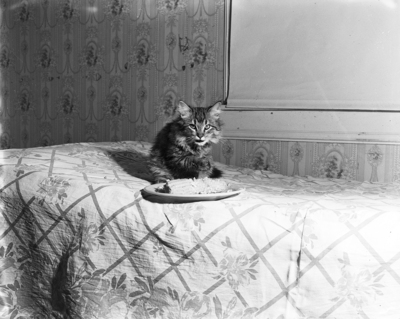 Earful keeps him cheerful. Kitten shown eating corn on the cob. The cat is owned by Mr. and Mrs. J. C. Roy.