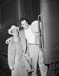 Texas' "I like Ike" train returned from New York Madison Square Garden Eisenhower rally. Getting off the train, are Melvin Shupp, left, and Dave Trevena, TCU students.