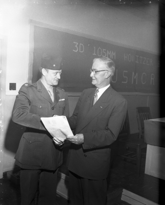Major C. Scranton Harrington, left, is presented orders activating a Marine Reserve artillery battery at a ceremony at the Navy and Marine Corps Training Center. Making the presentation is Dr. W. J. Danforth.