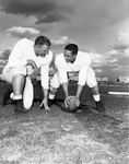 Charles Wrenn. left, 250-pound tackles from being happy, will be tested at offensive center during spring football practice at Texas Christian University. That is Bob McEachnern, senior pivotman, giving Wrenn a few tips. Published in Fort Worth Star-Telegram evening edition February 12, 1952.