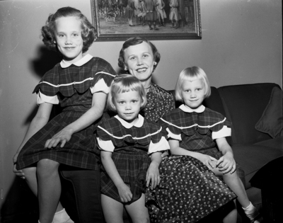 Mrs. A. J. Haueisen, 5017 Barnett, new president of the GDS Club, is pictured with her trio of daughters. Christina, left, 8, Gail, center, 3, and Karen Beth, 5. A woman with three female children wearing dresses.