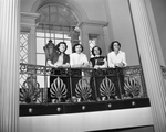 In Hubbard Hall, housing the student and faculty dining rooms, Redbud room and banquet halls, balanced meals are served. In the rotunda left to right, are Wanda Vacker, Sara Nelson, Mary Fenichis, and faculty member, Mrs. T. G. Magee, all of Fort Worth.