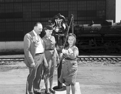 W. F. Kascal of Dallas, mechanical superintendent for the Texas & Pacific Railway, presents a shinned and polished engine bell to the Girl Scouts for a dinner gong at Camp Timberlake. The girls are Gail Wills, center, senior scout from Troop 35, and Gretchen Von Rosenberg of Troop 101.