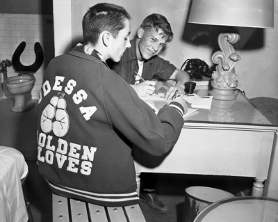 Golden Gloves Benny Davis (left), Monahans, and Charles (Chili) Reeves, Midland, write the home folks of their arrival in Fort Worth. They'll fight in the state tournament with the Odessa team. Published in Fort Worth Star-Telegram morning edition February 13, 1952.