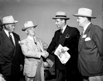 Among those at Meacham Field to welcome Secretary of Labor Maurice J. Tobin upon his arrival in Fort Worth were Ed McDonald of Dallas, left, regional director of the Bureau of Employment Security; Mayor J. R. Edwards, shaking hands with Tobin, and Ed Keenan, Washington, D. C., deputy director, Bureau of Employment Secretary, right.