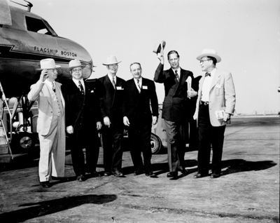 Welcoming Secretary of Labor Maurice J. Tobin here are Mayor J. R. Edwards and Texas Employment Commission officials. Left to right are Mayor Edwards; W. H. Farmer of Austin, TEC administrator; Colonel Dwight Horton of Austin, commissioner representing management on the TEC; Dean W. Maxwell of Austin, commissioner representing labor on the TEC; Secretary Tobin, and Harry Benge Crozier of Austin, chairman and executive director of the TEC.