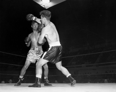 Alex Guerrero, El Paso middleweight with his eyes closed, tags scrappy Jack Edwards of Corpus Christi. Guerrero, knocked to the floor himself in the first round, won by a technical knockout in the second. Published in Fort Worth Star-Telegram evening edition February 14, 1952.