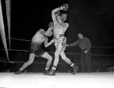Manuel Villalobos , El Paso featherweight, swings high after catching San Angelo's Henry Chavez with right uppercut. Villalobos scored technical knockout in second round of this State Golden Gloves bout. Published in Fort Worth Star-Telegram morning edition February 14, 1952.