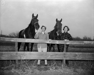 Beverly Baldridge. left, and Ruth McDonald shown with horses. Two Airline women enjoy when they ride on non-flying days. Published in Fort Worth Star-Telegram morning edition, March 23, 1952.
