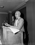 Ed Soule, Louisiana commissioner of labor, is shown in Hotel Texas as he addressed a session of Farm Labor Conference. A man wearing a suit is shown standing at a podium.