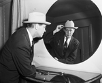 Secretary of Labor Maurice J. Tobin adjusts his new Shady Oak hat given him by Amon Carter. A man shown looking at his reflection in the mirror.