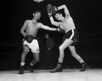 Ellis Cortez of Houston, left, and Amarillo's Pat McCarthy register facial frustration after near misses in their State Golden Gloves flyweight bout. McCarthy won decision. Published in Fort Worth Star-Telegram morning edition February 15, 1952.