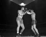 Corporal Thomas Busby, left San Antonio light heavyweight, fashions a second round technical knockout over San Angelo's Bill Leonard. Published in Fort Worth Star-Telegram evening edition February 15, 1952.