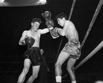 Francisco Aguirre, Waco flyweight, grimaces under fire of San Angelo's Connis Fisher, but bounces out to win by a decision. Published in Fort Worth Star-Telegram evening edition February 15, 1952.