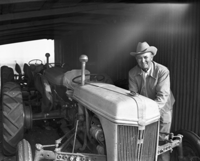 L. A. Strain, Mitchell County farmer and sockman, checks under the hood of one of his seven tractors.