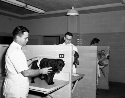 Small animal treatment, a big part in veterinary practice, is taught extensively at the A&M school. Here dogs are shown in a treatment room for examination by Harold Pruett, left, Fort Worth; Bill Parker, center, Fort Worth, and Clyde Odom of Laurel, Miss.