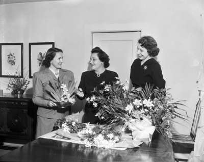 These members of a special committee from the Junior Woman's Garden Club are shown here readying springtime flowers for rooms at the base hospital at Carswell Air Force Base. Left to right, Mrs. E. E. Stell, Mrs. Maurice Harkins, and Mrs. Hugh McClure. Three woman wearing formal suits, and a table with flowers on it.