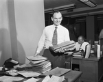 One of Stanolind Oil & Gas Company employees at Tulsa who this week-end started the journey to Fort Worth is, in left photo, Harold A. Groh, cleaning out his desk.