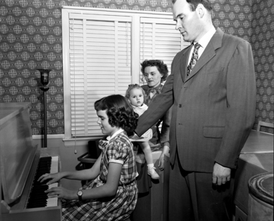 One of Stanolind Oil & Gas Company employees at Tulsa who this week-end started the journey to Fort Worth is Harold A. Groh, taking time out from his moving chores with his wife and two daughters, Sandra at the piano and Rebecca on her mother's lap.