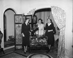 Mrs. George M. Davis, center, displays souvenirs of her former homes in foreign lands, where she lived as the wife of an American Army officer. With her are Mrs. C. P. Hines, left, and Mrs. Arlon J. Wylie.