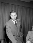 Jenkin Lloyd Jones, an editor for the Tulsa Tribune. He was a guest speaker at the Texas Daily Newspaper Association meeting. Jenkin Lloyd Jones is shown wearing a business suit.