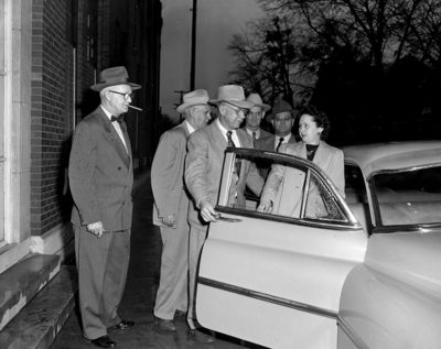 Mrs. Myrtle Hockett tries out her car for size as she attempts to fit her five bosses into the vehicle in preparation for the Beta Alpha Rho Bosses Banquet at Glen Garden Country Club Beta Alpha Rho members are the hosts to their bosses at this annual event. O. T. Clark will be the speaker. Left to right, Earl Justin, John Justin, H. M. Fisch, Sam Justin, Bill Agee and Mrs. Hockett. Five men and one woman are all standing together near a car.