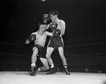 Jack Blair of Tyler starts trip to canvas after absorbing punch from Bantamweight Jessie Salazar of Amarillo. Salazar's next bout will be with Paul Jorgensen. Published in Fort Worth Star-Telegram morning edition February 16, 1952.
