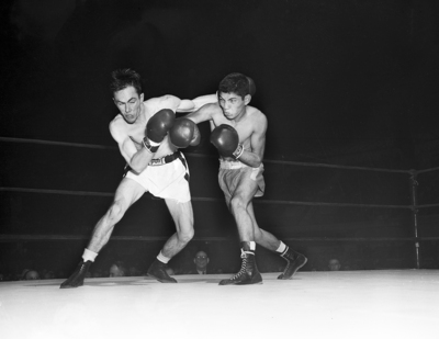 Tony Murillo, right, McAllen bantam, lets a left slide over his shoulder and cocks his own left for shot at Kenneth Tyer's chin. Murillo posted third round TKO over the Houston entry. Published in Fort Worth Star-Telegram morning edition February 16, 1952.