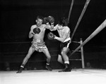 Manuel Villalobos of El Paso, left, and Billy Trice, Corpus, mix in featherweight bout. Published in Fort Worth Star-Telegram morning edition February 18, 1952.