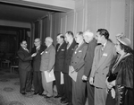 Edward W. Pastore, left, of New York, adjusts silver keystone award the neck of Fritz J. Keller, president of the Panther Boys' Club. Other club officials who won awards are, left to right, Mayor Deen, H. H. Hesler, William D. Morris, F. V. Thomson, R. W. Fender, Fred Daring and Mrs. S. G. Bittick. A group of men and woman in formal clothing.