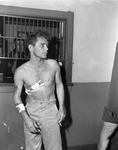 Robert Barber, who murdered a detective, at police headquarters after being recaptured from his escape from Saint Joseph's Hospital where he was being treated for a gunshot wound in the chest after a shoot out with city Detectives Henry Cleveland and A. L. Armstrong.