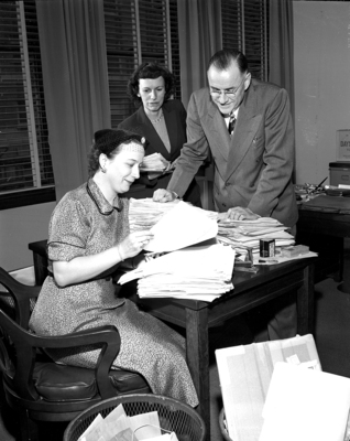 Entries in the Star-Telegram's 1952 regional Scholastic Writing Awards program totaled 1,986, a gain of 783 over last year. Manuscripts were received by Mrs. Rita S. McAlister, left, preliminary reader; Miss Virginia Van Osdol, secretary to David Sellars, right, general chairman of the awards program. Judging now is in progress. One man and two woman are looking over stacks of paperwork.