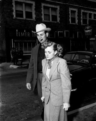 Mrs. Doris Faye Barber, 21, arrived here from Dallas to talk with her husband, Robert H. Barber, 26, only to learn he had just escaped from Saint Joseph's Hospital. He was at the hospital to be treated for a gunshot wound he received after a shootout with City Detectives. She is shown here being escorted by Police Officer H. E. Middleton to city jail for questioning. A man wearing a cowboy hat and suit. A woman wearing a suit and neck scarf.