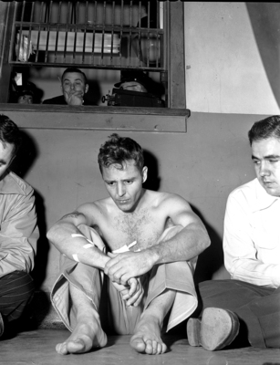 Robert Barber, sitting on floor after being recaptured from his escape from Saint John's Hospital. He was being treated there are receiving a gunshot wound from a shootout with city Detectives in which he murdered one.