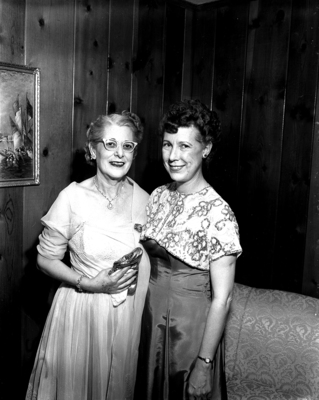 Mrs. Flora Besst Boone, left, of Littlefield, pays her fraternal visit as worthy grand matron of the Texas Order of the Eastern Star to Southside Chapter 673. Her hostess here is Mrs. Geneva Wright, worthy matron of the chapter. Two woman are wearing dresses.