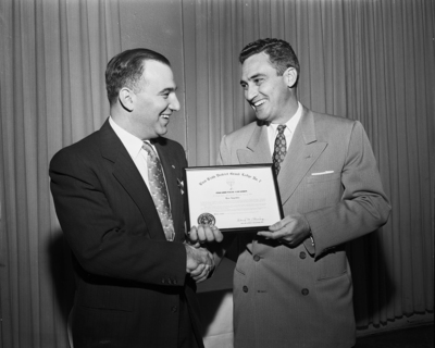 Leo Lipshitz, president of the local B'nai B'rith lodge, a citation from David M. Blumberg of Knoxville, district grand lodge president, at the Jewish service organization's annual state conference at the Hilton Hotel. Two men wearing suits, holding up a frame.