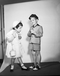Tim Halie, nattily attired in Twigs rayon check suit, helps Diane Dearmin, wearing a Bo Peep Original, get ready for the children's style show to be staged at Mary Louise Phillips elementary School to provide funds for the school library. The clothes are from Young Modern. Published in Fort Worth Star-Telegram morning edition March 16, 1950.