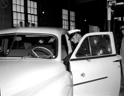 Patrolman V. M. Gilmore inspects the bullet-riddled car in which Robert Hugh Barber made a vain attempt at escape. the 26-year-old slayer stole the vehicle from Mrs. J. F. Jackson, 2108 Weatherbee, as she drove into the Saint Joseph Hospital parking lot. Part of the bullet holes were made by Barber, returning the fire of officers. man in police unifrom looking on the inside of a white car.