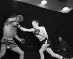 Pat McCarthy, Amarillo flyweight, scores with right hook to the head of San Antonio's Jesse Herrera in second round of their Golden Gloves semifinals bout at Will Rogers Memorial Coliseum. McCarthy went on to win the decision and then came back later to annex state title. Published in Fort Worth Star-Telegram morning edition February 19, 1952.