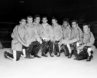 Here are the boys who'll represent Texas in the Chicago Tournament of Champions. Left to right: Henry Miramontes, Dallas bantam; Johnny O' Glee, Dallas welter; Alphonso Merin, Wichita Falls light heavy; Campbell Woodman, Wichita Falls heavyweight; Roy Harris, Brownwood middle; Pete Perez, Amarillo lightweight; Raymond Riojas, Fort Worth featherweight, and Pat McCarthy, Amarillo fly. Published in Fort Worth Star-Telegram evening edition February 19, 1952.
