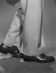 Fundamental changes in silhouette are called for in the 1952 "natural line" suits, and a pair of them are shown here. Shoulder is de-emphasized. Note narrow lapel with high notch and welt seaming, square-folded handkerchief. Trousers are straighter hanging, narrower. Shoes. Close up of trousers and shoes.