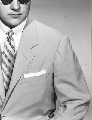 Fundamental changes in silhouette are called for in the 1952 "natural line" suits, and a pair of them are shown here. Shoulder is de-emphasized. Note narrow lapel with high notch and welt seaming, square-folded handkerchief. Trousers are straighter hanging, narrower. Close up of the left side of the suit. The bottom half of the man's face is visible.