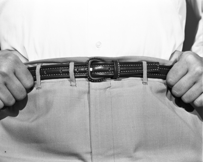 These belts not only have a purpose - they're good looking as well. Top, leather harness-stitched by hand in contrasting thread, with covered belt buckle. Close up of the belt, the man has his hands on either side of the belt.