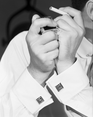 To link together French cuffs are these smart and conversation-making buttons. The links at left show the cattle brands of Stephen F. Austin, on the left cuff, and Cabeza de Vaca. Close up of the cuff links. The man is holding a lighter and an unlit cigarette.