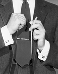 To link together French cuffs are these smart and conversation-making buttons. Rhinestones gleam on the black link and on the gold links and tie bar. Close up of the cuff links and the torso of a man wearing a suit and tie. The man is holding a cigarette.