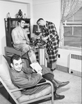 Plaids take the limelight in robes this spring, brighten the lounging hours, whether at home, in travel or in the dormatory, as here. Foreground, a scarlet-rust in zephyr-weight challis wool, with blue tattersall check. Center, a medium-weight wool tailored plaid of tan and brown contrasting squares. Right, an authentic Scottish tartan in a mixture of 55 per cent lamb's wool, 45 per cent long staple Egyptian cotton. Three men are wearing the robes. One man is sitting in a chair, another is sitting on a table, and the last man is standing.