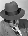 The hat, narrow brim and single crease. The man wearing the hat is looking down.